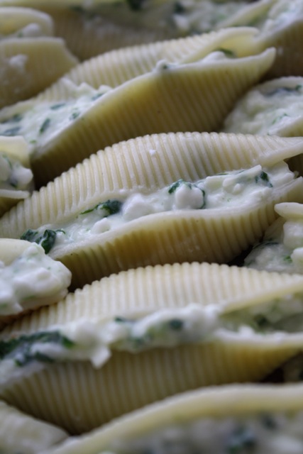 Cook the pasta in the large pot of water, according to the package directions. It's important that the pasta be cooked al dente (if it's too soft, it will tear during filling), so you may wish to take a minute or so off of the minimum cooking time. Keep an eye on the shells to check doneness and be sure to stir occasionally to keep shells from sticking to the bottom of the pan (this might also cause them to tear). Don't worry if a few shells get broken - I've added extras to the recipe to account for this! Drain and allow shells to cool until they can be handled safely and comfortably.